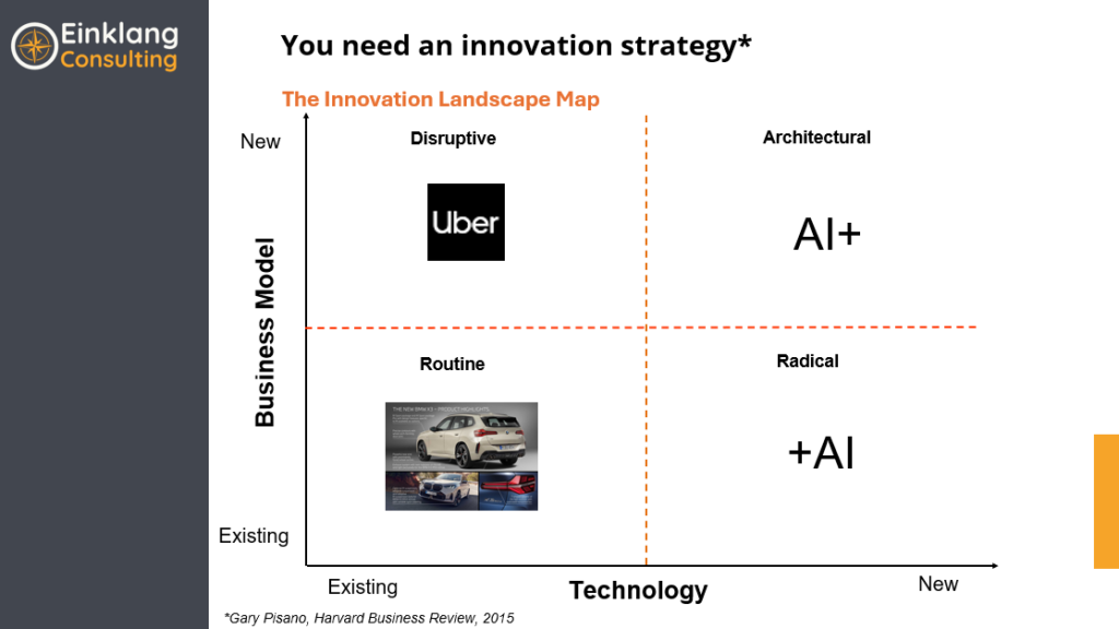 J'ai toujours pensé que Gary PisanoLa carte du paysage de l'innovation, présentée dans la Harvard Business Review en 2015, fournit un cadre précieux pour l'organisation de l'innovation. Cette matrice classe l'innovation en quatre catégories : routinière, perturbatrice, radicale et architecturale. Je pense que la compréhension de ces distinctions est cruciale pour les entreprises qui cherchent à aller au-delà de la simple intégration de l'IA dans les processus existants. En tant que IBM les organisations doivent passer d'un état d'esprit +AI - où l'IA est un ajout aux opérations actuelles - à une approche AI+, où l'IA est à l'origine de modèles d'entreprise transformateurs. Pour y parvenir, il faut une stratégie d'innovation solide. Je pense également qu'il est essentiel de lier l'innovation axée sur l'IA à une stratégie plus large. Il faut pour cela